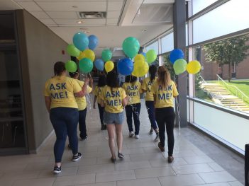 Students in yellow Ask me t-shirts holding balloons at the Barrie Campus